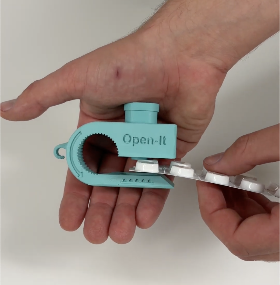 Open-It combineert vijf functies in één tool. Je kunt: pillen eenvoudig uit strips drukken, doppen van flessen openen, blikjes openmaken. lipjes liften van verpakkingen en ritsen gemakkelijk open en dicht ritsen.